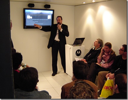 Como se puede apreciar en la imagen, este era el "salón" donde el disertante nos "informó" sobre las diferentes aplicaciones de las tecnologías de Motorola, el cual era totalmente abierto permitiendo el ingreso de cualquier persona que pasara por el stand, lo cual genero mucho malestar entre los asistentes previamente acreditados, y otro tema fue la duración del seminario que fue de ¡¡¡¡¡15 minutos!!!!! en los cuales no escuchamos ningún tipo de contenido técnico ni mucho menos, tampoco entregaron certificados a los asistentes.